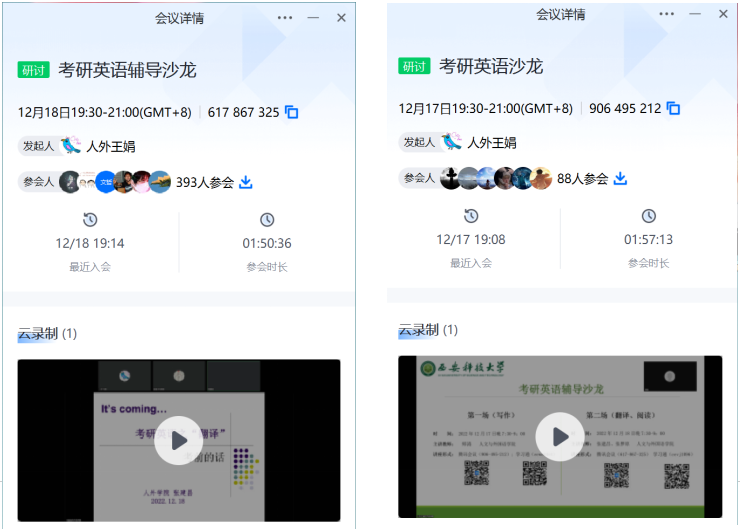 2022年12月17日晚师涛老师从写作的阅卷规则和员工作文实例出发为同学们讲解了写作提高的方法;12月18日晚张建昌老师以历年真题为例,从译文的独立可读性、全部否定句、定语从句等方面讲解了考研英语试卷中涉及的翻译策略;张梦原老师分析了近三年考研真题阅读篇章的难易程度,从中为员工梳理出难句分析、近义替换、态度判断等技巧方法。