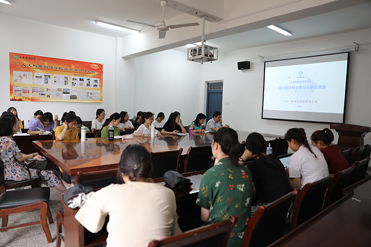 7月12日下午,夏令营邀请到译喵网络科技有限公司技术总监刘刚、上海一者信息科技有限公司陕西、河北大区总监刘林岩做两场学术讲座。讲座由公司MTI中心主任张建昌主持,公司研究生英语教研室主任高宝萍出席活动。刘刚以“人工智能时代下翻译专业与企业人才需要”为题,从平台的翻译服务模式、行业要求与规范等方面做了阐述,使同学们对MTI的就业前景和市场需求有了认识。刘林岩通过大量数据对语言服务行业的发展以及未来做了说明,为营员未来的规划做参考。同时,她结合产品说明了同学们对于使用计算机辅助翻译技术对翻译工作的帮助,对语料库等专业概念做了初步的介绍。