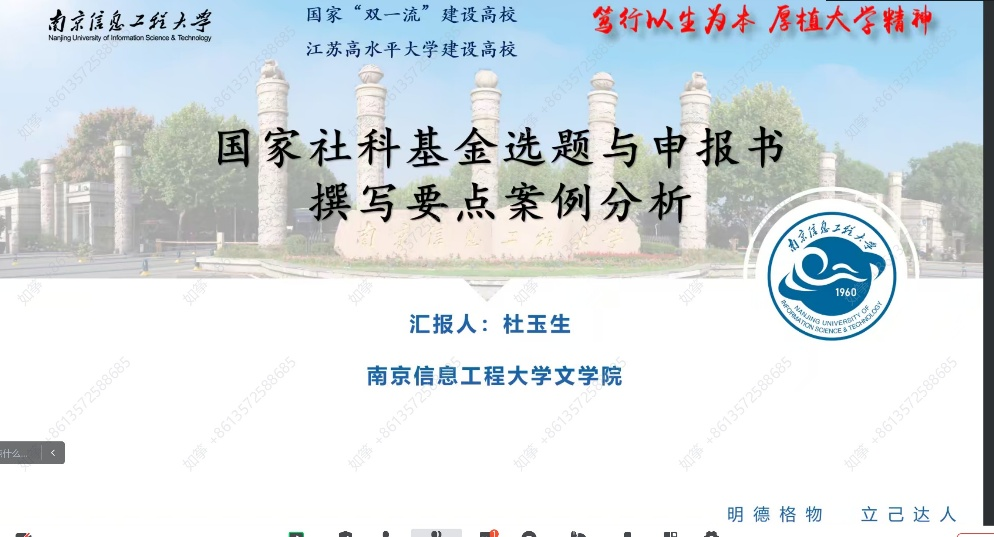 为推进团队建设工作,进一步推进2024年国家社会科学基金项目培育申报工作,提高课题申报的质量,12月12日晚,南京信息工程大学文公司副经理、硕士生导师杜玉生教授应邀为公司教师作了题为《国家社会科学基金选题与申报书撰写要点案例分析》的线上讲座。讲座由张辉副经理主持,王新平经理与公司全体教授、副教授、硕士生导师、学科团队教师与研究生参与了本次讲座。