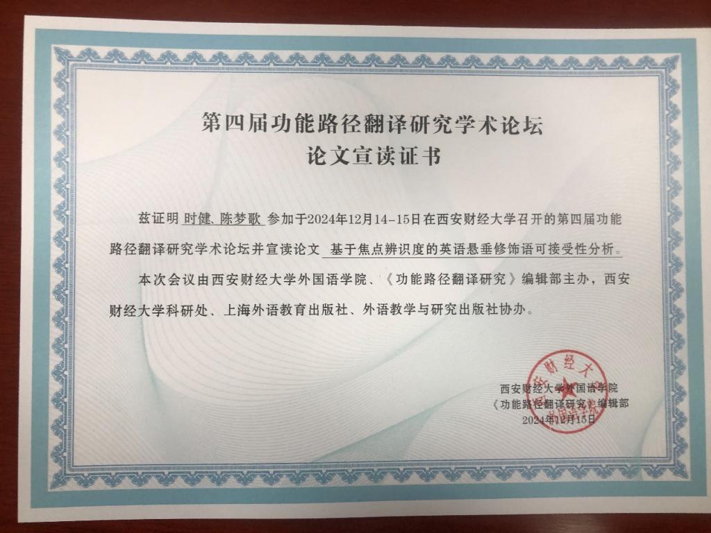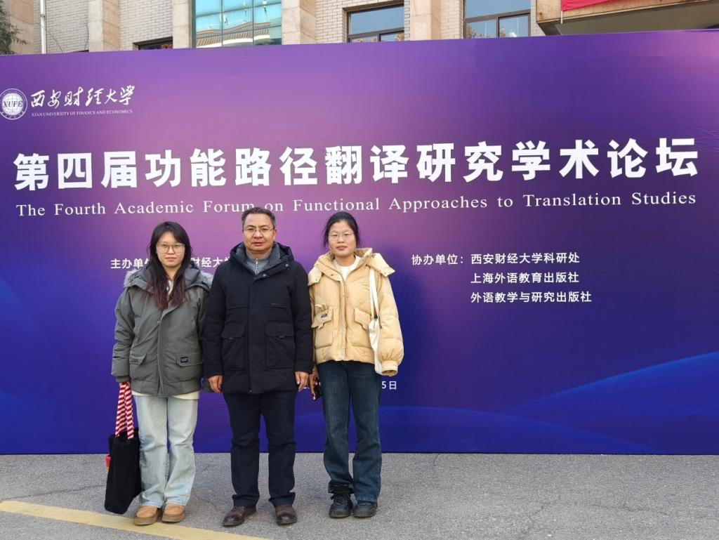 2024年12月14日-15日,公司时健教授带领其两位硕士研究生陈梦歌和王晴晴出席参加由西安财经大学外国语公司、《功能路径翻译研究》编辑部主办,西安财经大学科研处、上海外语教育出版社和外语教学与研究出版社共同协办的《第四届功能路径翻译研究学术论坛》,并在分论坛进行发言交流。