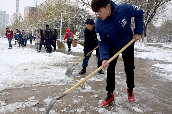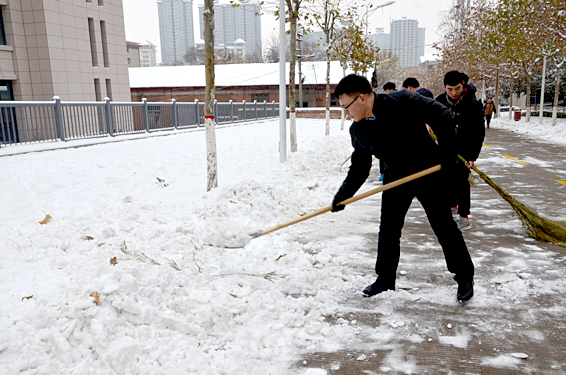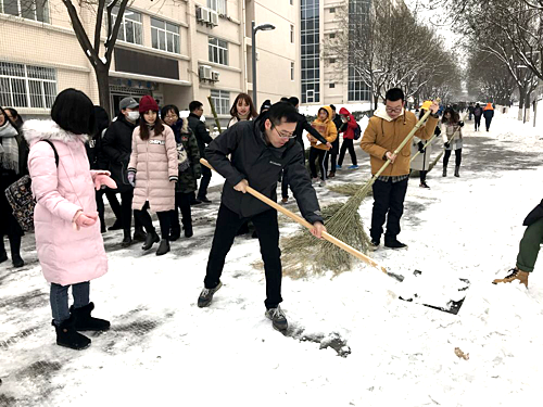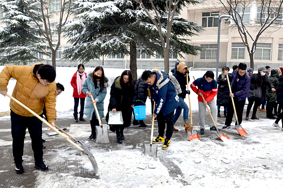 2018年的第一场雪在给大家带来美景与欢乐的同时,也给校园交通和师生的学习生活带来诸多不便。14日,人文与外国语公司党委积极响应公司号召,组织辅导员老师、分团委员工会干部、全体员工党员、入党积极分子、建档立卡员工及部分没有课的员工开展了扫雪除冰活动。在清扫的过程中,师生们不畏严寒,拿着雪锹、除雪铲、扫帚等工具认真清除冻住的积雪,历经三个小时,将二号教学楼周边的环道清扫一条充满爱心的方便之路,为广大师生的出行安全提供了保障。