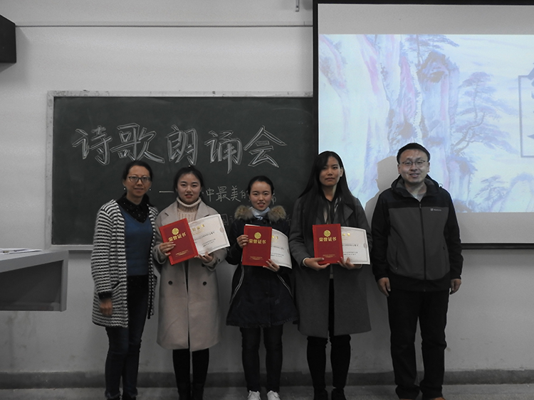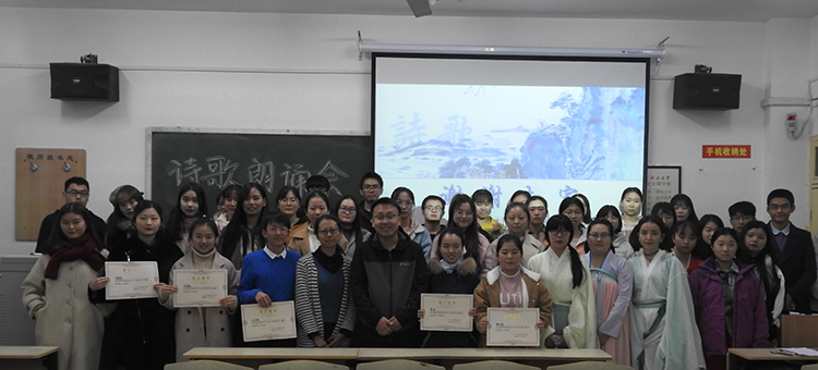主持人李思淼首先介绍了本次活动的比赛规则及评分标准。本次朗诵会共有29组同学参与,朗诵内容由参赛选手自行选定,选手可以自己制作PPT和选择播放背景音乐来烘托气氛、感染听众。随后大家按照抽签顺序,依次上台朗诵《扬州慢》、《中国少年说》、《再别康桥》和《葬花吟》等作品。其中《葬花吟》的朗诵者身着汉服,将听众带入了黛玉葬花的凄美悲凉意境中,令人印象深刻。活动前后持续一个多小时,经评委老师打分和在场听众的举手表决,最终机械公司王洪炼荣获一等奖,汉语言文学1701班李露茜、1801班谢沛娟获得二等奖,汉语言文学1701班李思淼、胥悦、韩娇获得三等奖。