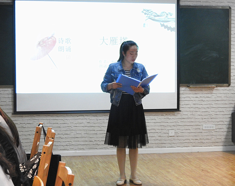 “夜阑卧听风吹雨”小组选取的是诗人杨炼的代表作《大雁塔》,用铿锵有力的朗诵演绎了诗人沉重的历史感、沉郁悲怆的英雄意识和强烈的爱国之情,也拉近了这座千年古城与师生们的距离,让大家对大雁塔有了新的认知。