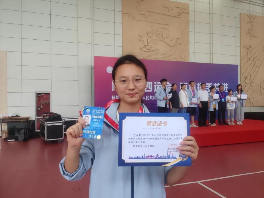 故事还得从体育课开始,在高中,热爱运动的何雨露就已经是公司啦啦操队的一员了。来到了西科,她想着既然热爱就继续学下去,于是便选修了啦啦操课。今年五月底课程结束后,因为课堂表现优异,被十四运员工群众演员招募老师破格面试。