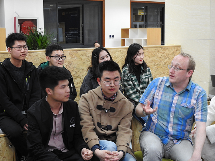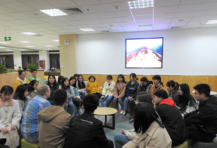 阳春三月,春意渐浓。3月15日晚7点整,ballbet贝博新学期第一次“英语角”活动在临潼校区骊山校园图书馆一层创客空间正式启动。本次活动由英语1601班主办,班级全体成员及部分英语爱好者参与活动。外教James与同学们环坐详谈,对同学们感兴趣的留学、工作、国际问题等话题一一展开,进行了认真的分析。