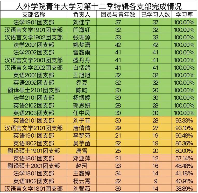 本次青年大学习,法学1901团支部、汉语言文学1901团支部、汉语言文学1902团支部、法学2001团支部、法学2002团支部、汉语言文学2001团支部、汉语言文学2002团支部、英语2001团支部、英语2002团支部、法学2101团支部、英语2102团支部、英语2103团支部、翻译硕士2101团支部学习率达到100%, 5个团支部学习率达到80%以上,但仍有5个团支部学习率没有达到80%。