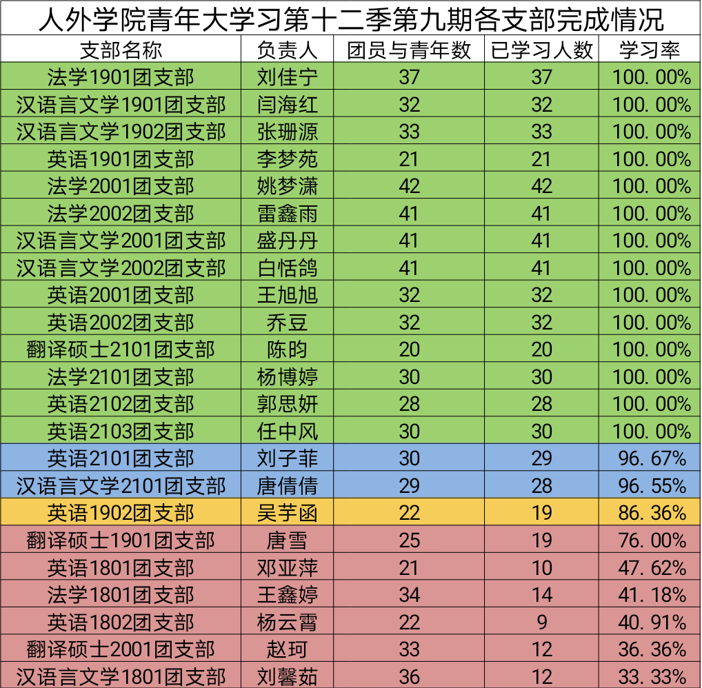 本次青年大学习,法学1901团支部、汉语言文学1901团支部、汉语言文学1902团支部、英语1901团支部、法学2001团支部、法学2002团支部、汉语言文学2001团支部、汉语言文学2002团支部、英语2001团支部、英语2002团支部、法学2101团支部、英语2102团支部、英语2103团支部、翻译硕士2101团支部学习率达到100%,2个团支部学习率达到95%以上,1个团支部学习率达到80%以上,但仍有6个团支部学习率没有达到80%,在此,希望本期完成率高的团支部能够再接再厉,而学习率欠佳的团支部,请各团支书能够起到引领作用,向所有同学强调青年大学习的重要程度,呼吁并监督大家积极学习视频内容并完成课后习题。积极提高自己的思想觉悟,坚定跟党走的决心,争做新时代新青年!