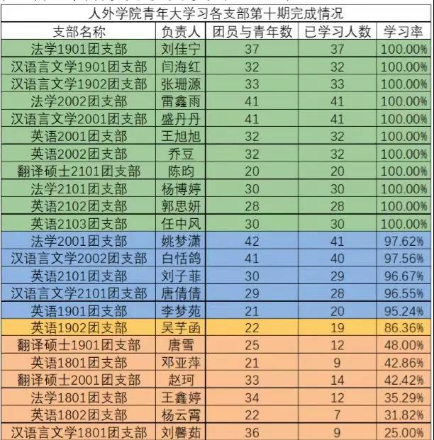 在本次青年大学习中,共有11个团支部青年大学习完成率达到100%,位于90%至100%的团支部有5个,位于80%至90%的团支部有1个,总体而言呈现一种好的态势,但仍有6个团支部青年大学习完成情况不理想,在此希望学习积极的团支部继续保持,青年大学习完成情况较差的团支部向好的团支部看齐,从青年大学习中汲取红色基因,感悟百年来党和人民不懈奋斗带来成就的根源。
