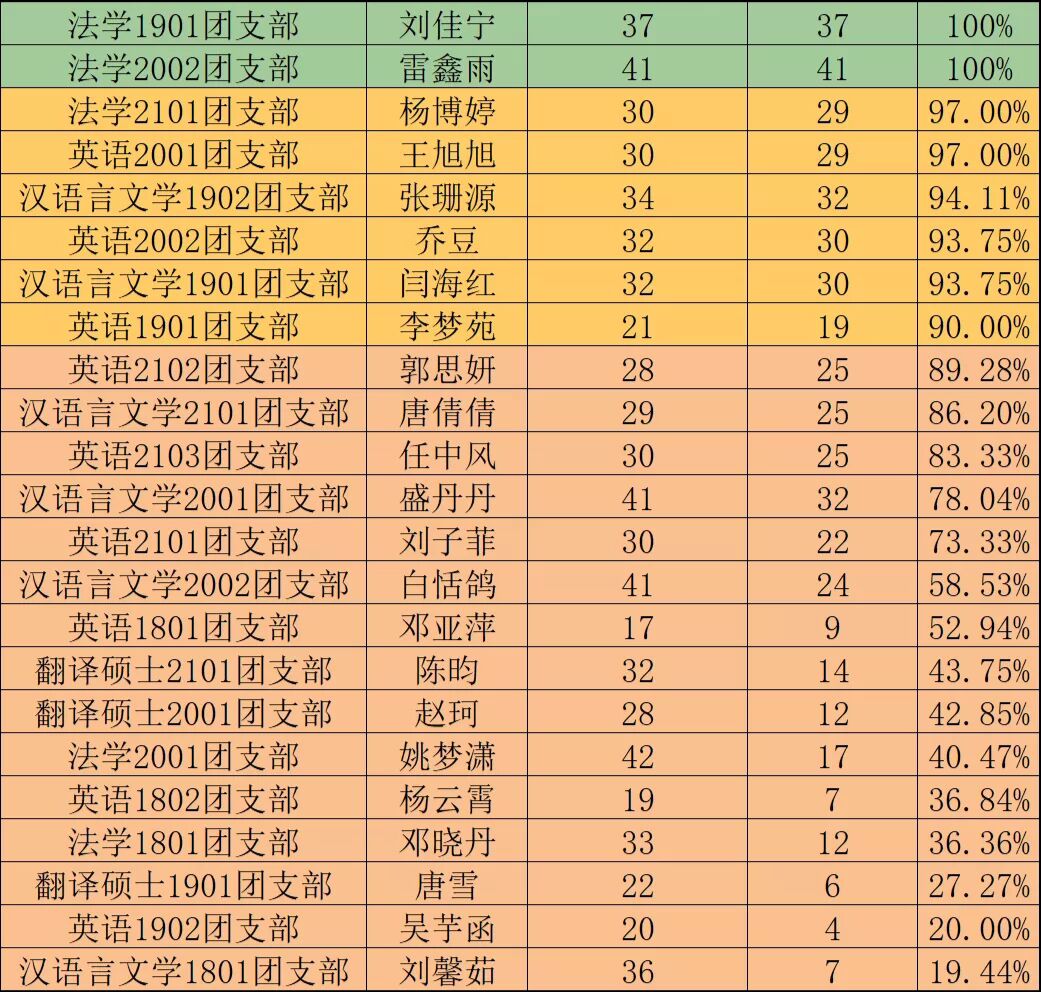 本次青年大学习,法学1901团支部、法学2002团支部学习率达到100%,6个团支部学习率达到90%以上,3个团支部学习率达到80%以上,但仍有12个团支部学习率没有达到80%,在此,希望本期完成率高的团支部能够再接再厉,而完成率不高的团支部,请各团支书能够起到引领作用,向所有同学强调青年大学习的重要程度,呼吁并监督大家假期内积极学习视频内容并完成课后习题。积极提高自己的思想觉悟,成为一名跟党走的优质青年。