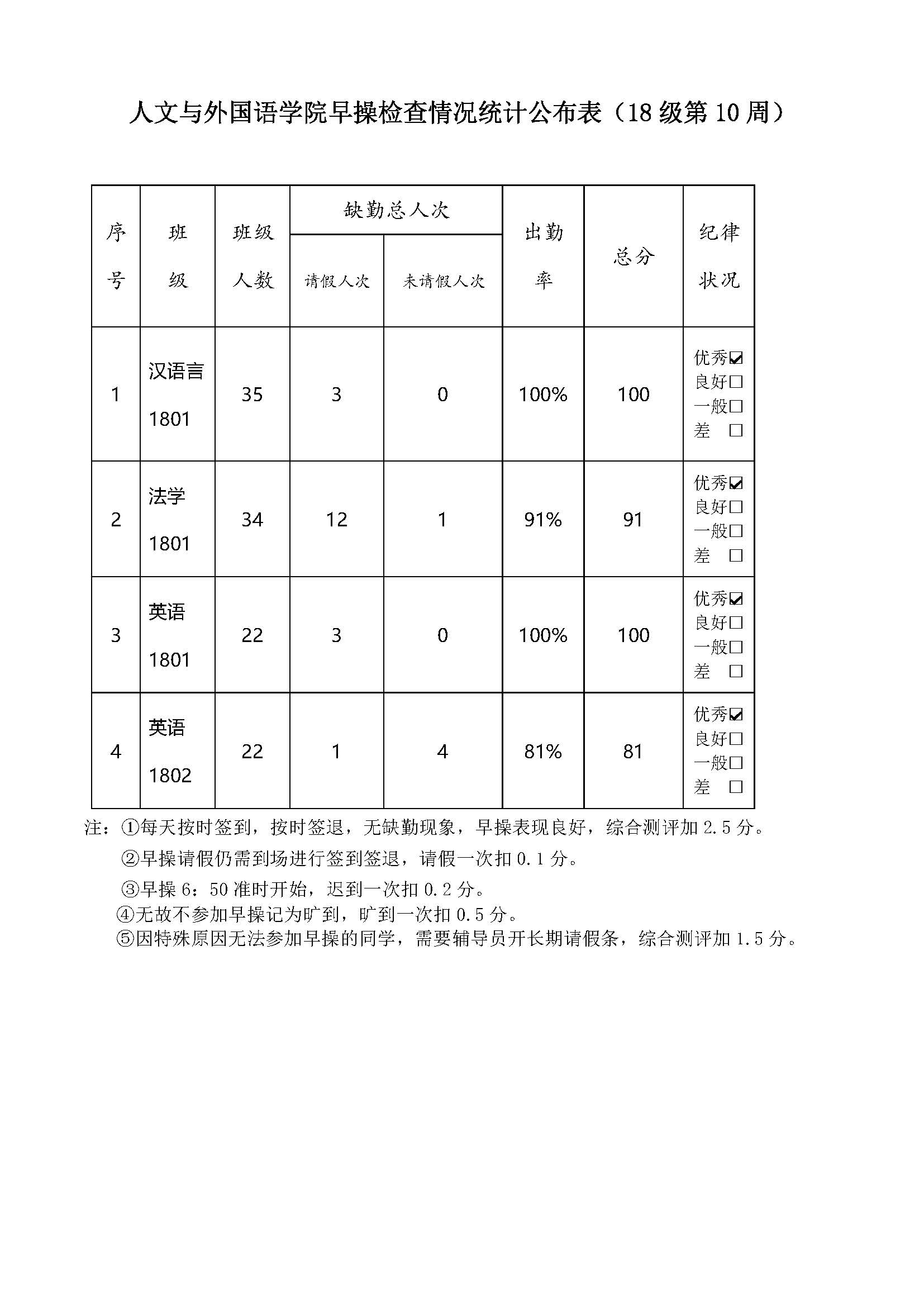 ballbet贝博早操检查情况统计公布表(18级第10周)
