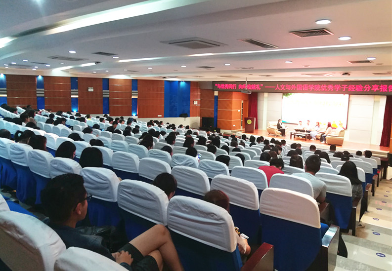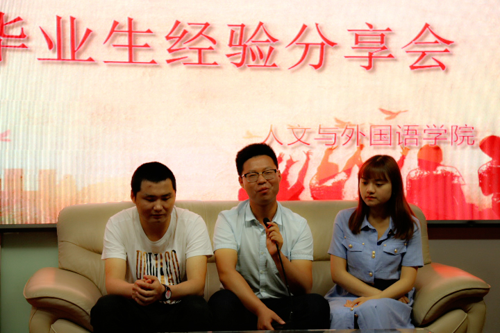 报告会上,五位毕业生代表风趣幽默、妙语连珠,结合自己在校四年的员工、生活经历分享了自己的心得体会。考取中央民族大学研究生的刘佳佳讲述了自己的考研五部进行曲,指出:“资料不在多,关键要用功”,并鼓励学弟学妹们“要热爱生活、热爱学习、敢于幻想、敢于尝试,争做新青年”。成功保研至公司的杨帆以“绩点”和“证书”为主线就“如何保研成功的经验”对自己的保研之路进行了总结与分享,强调保研是大学前三年的一场总体考核,表示:“为了改变自己,要敢于摒弃‘不自信’的标签,还要主动交流、善于思考,更要有研究精神。” 出国深造的陈欢分享了自己大学期间在国外作交换生、徒步旅行、创业合作的点点滴滴,针对同学们满脸的好奇、惊讶和各种各样的问题,面带微笑地指出干部经历、雅思成绩对于出国的重要性并鼓励大家:“要坚持自己的兴趣,大胆的去外面的世界看看,让自己拥有一份永生难忘的经历。”通过司考的陈勇围绕司考的通关率和就业前景侃侃而谈,指出司考是一场持久战,贵在坚持,并鼓励大家要准确定位自己,在明白学习是员工第一要务的同时要注重处世智慧与做事能力的修炼,为大四的就业做好铺垫。顺利入选的选调生的刘高宏分享了自己的宿舍故事、班长故事以及兼职故事,对于即将深入基层、服务基层、扎根基层的他表示:“这一切是我无悔的选择。”