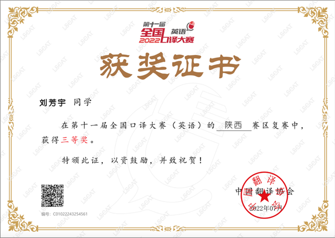 此次大赛由中国外文局指导、中国翻译协会主办,中国翻译协会语言服务行业创新创业中心及北京甲申同文翻译有限公司承办。本次大赛形式为英汉、汉英交替传译,比赛内容涵盖时事热点及新闻。公司参赛选手杨皓月、张新婧、刘芳宇三位同学顺利分别以陕西省第26名、32名和80名的好成绩晋级大区赛,并获得陕西赛区二等奖2项、三等奖1项。