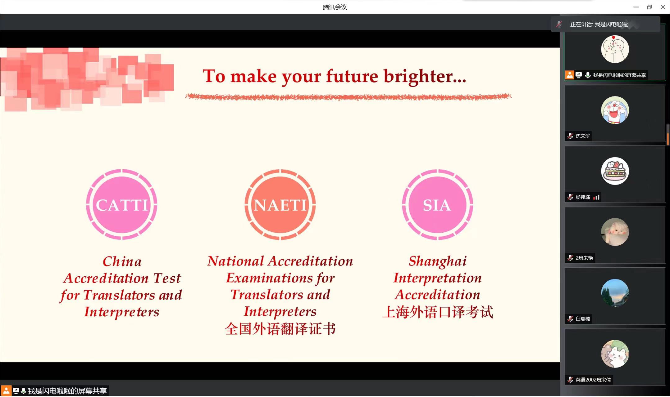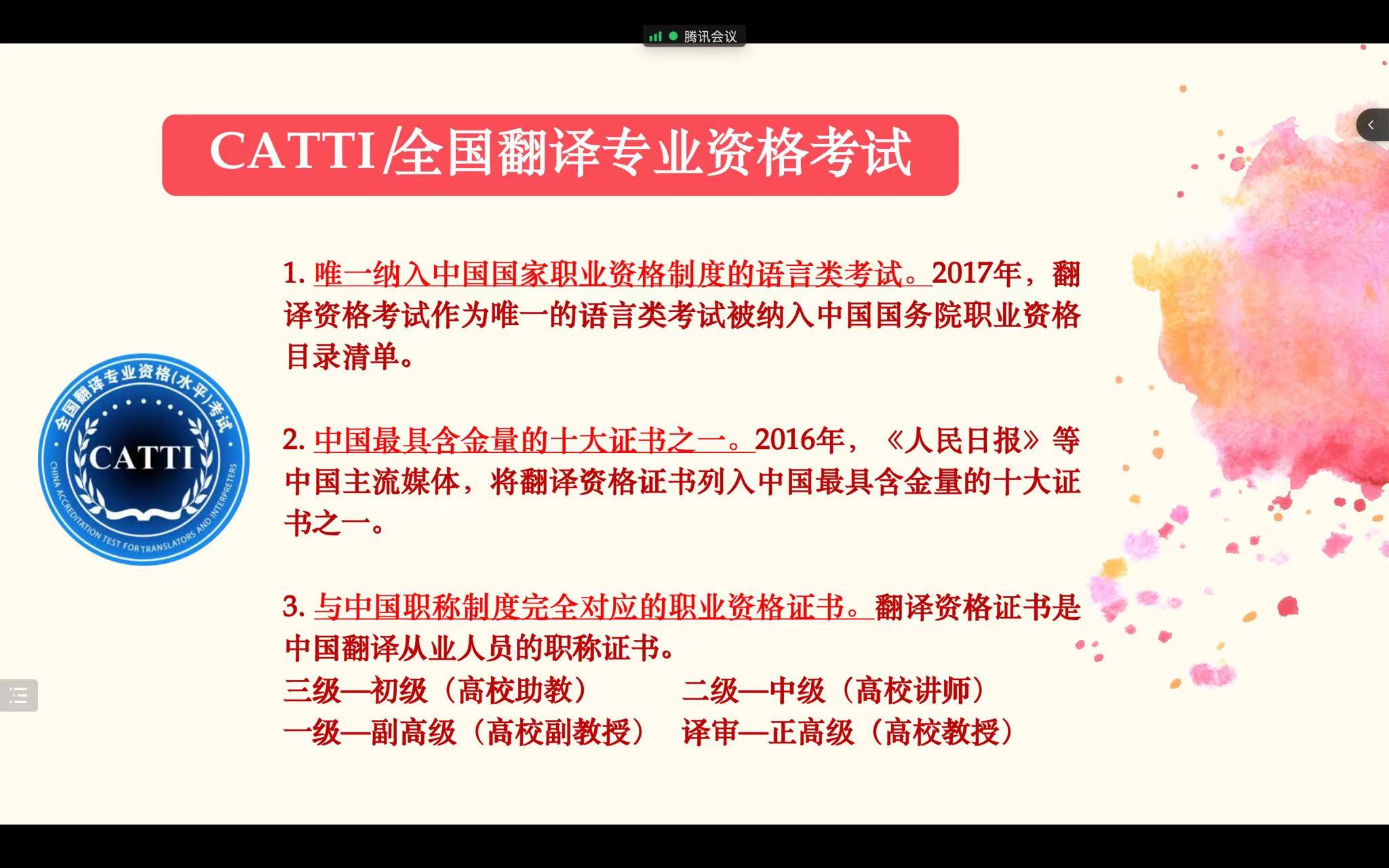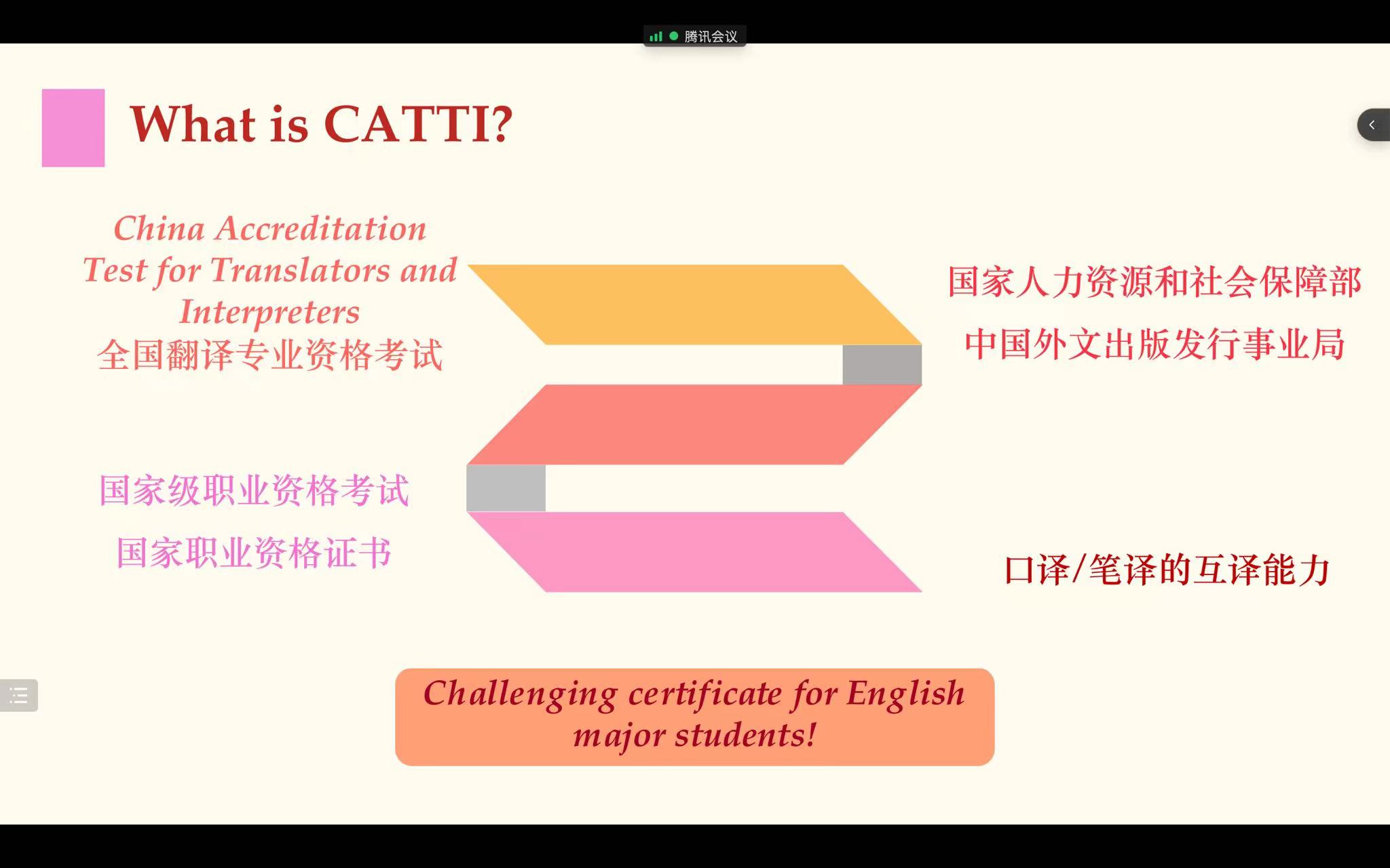 4月12日下午,ballbet贝博英语2001班举行了“CATTI介绍”主题班会。本次班会由班主任张梦原主持,英语2001班全体同学参加,受疫情影响,本次班会在线上举行。