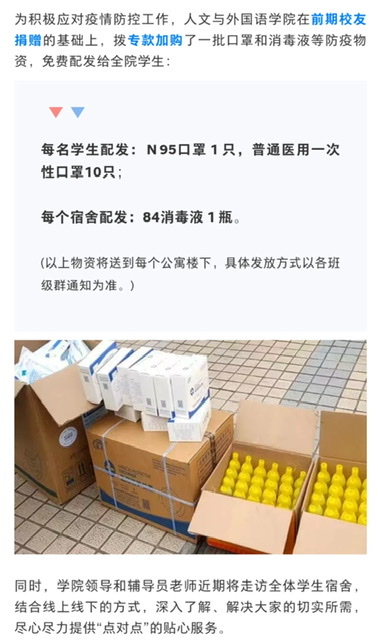 据悉,为帮助同学们顺利度过这段封闭管理期,公司多措并举开展各项人文关怀。除为全院员工免费发放口罩、消毒液等防疫物资外,公司领导和辅导员老师近期还将走访全体员工宿舍,并畅通信息反馈渠道,在网上公布公司领导联系方式和电子信箱,设立《ballbet贝博员工防疫期间困难需求收集表》,结合线上线下的方式,深入了解、解决大家的切实所需,尽心尽力提供“点对点”的贴心服务,以保障员工学习和生活有序进行。