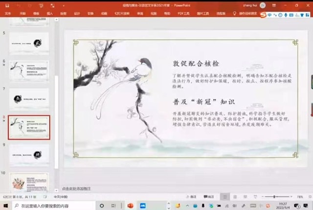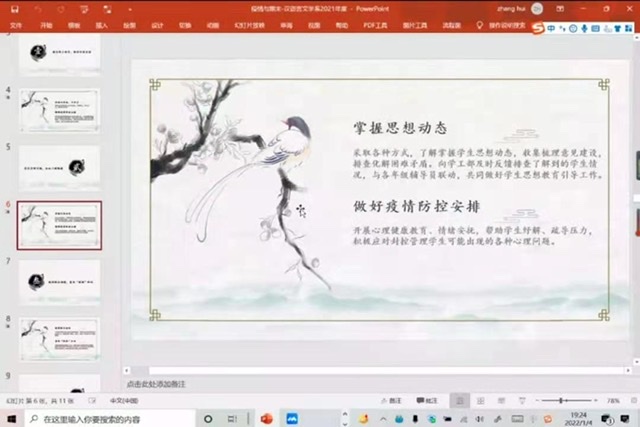 疫情期间,确保员工的心理健康与生命安全同等重要,合理安排“宅居”时光,是充实心灵、缓解焦虑的有效方式。张辉从“做好防控安排,有序线上教学;强化思想引领,关注心理健康;普及新冠知识,敦促配合核检、持续宣传报道,畅通求助通道”四个方面对目前的形势、教学重心进行了简明扼要的概述。中文系各年级员工应保持积极乐观心态,理解并配合公司政策。目前已为各年级员工疫情期间学习重心进行了相关安排,21级开始线上教学,20级即将举办读书会,19级开展考研规划专场讲座,对18级进行毕业论文指导。