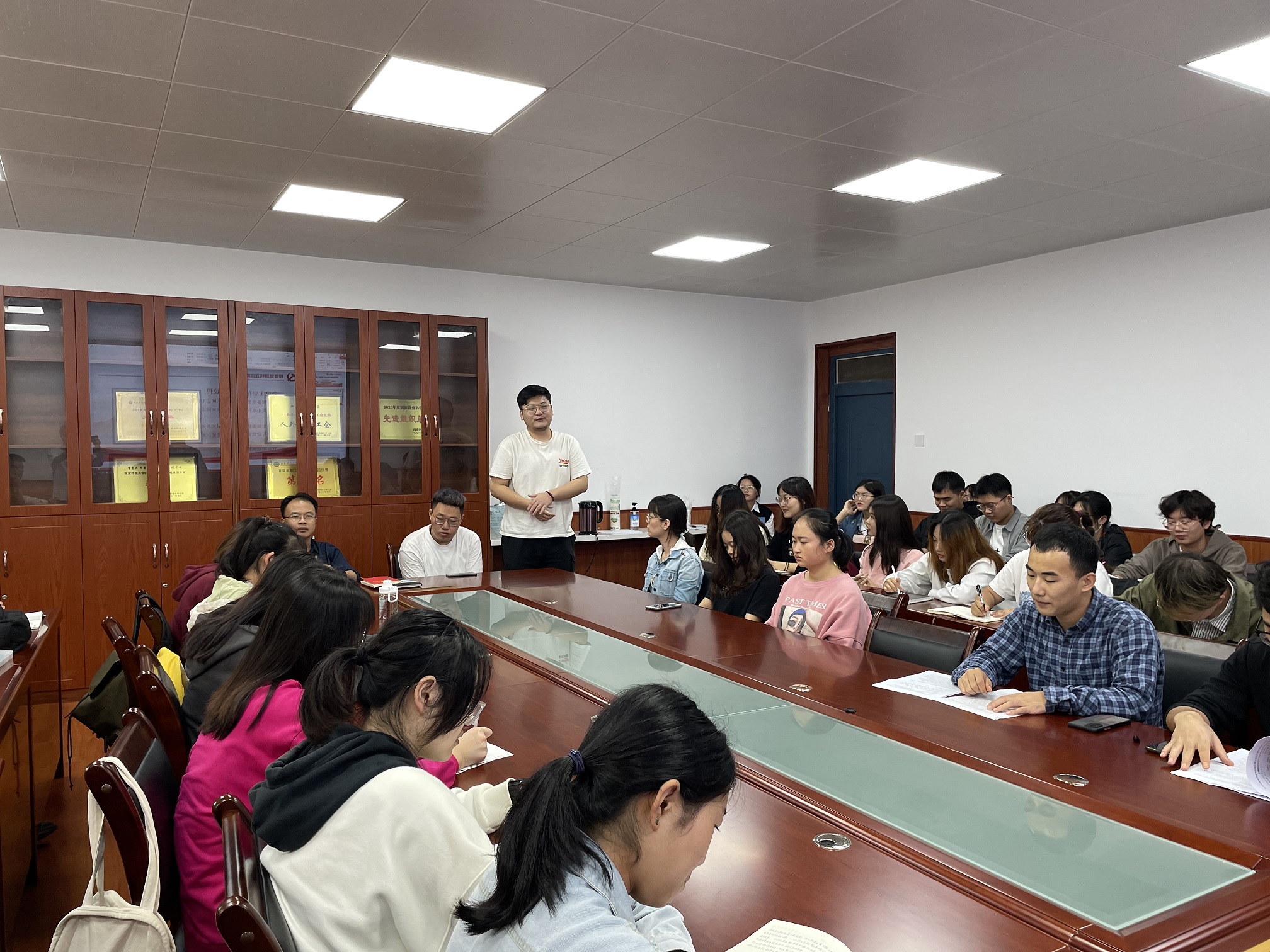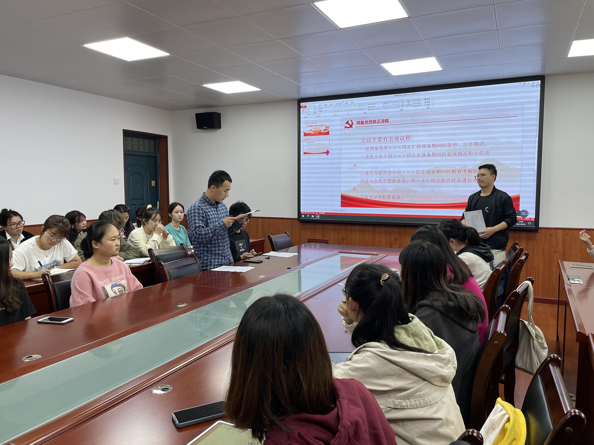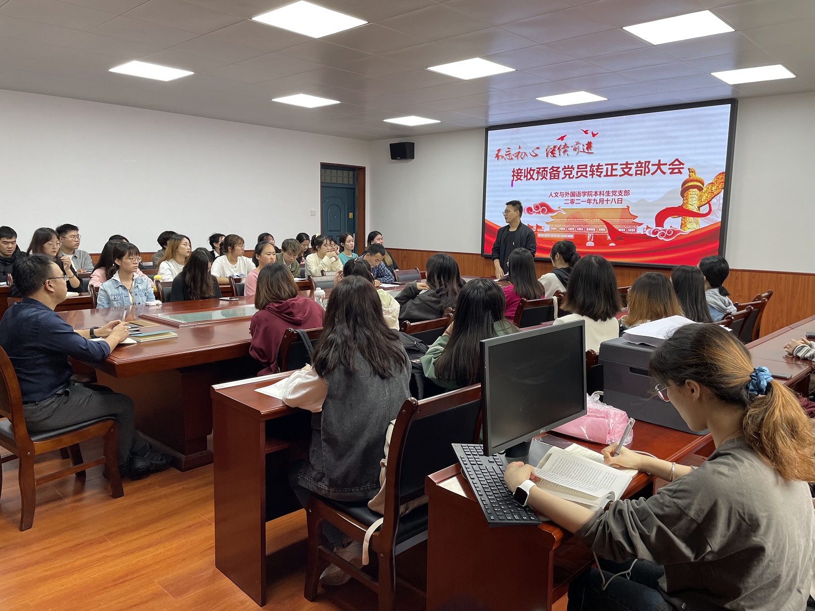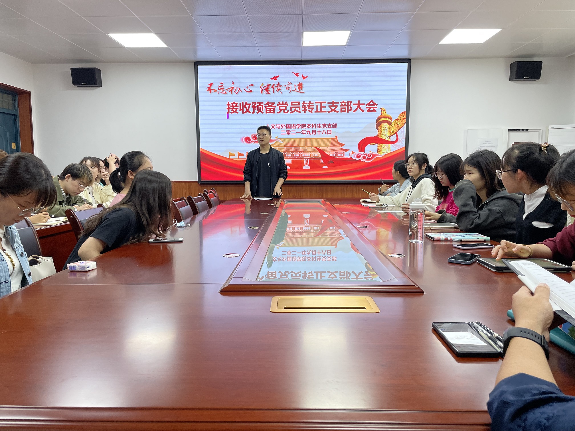 9月18日上午,ballbet贝博本科生党支部于二教226会议室召开接收预备党员转正支部大会。公司党委副书记张振中及党支部全体成员参加了此次会议,本次会议由公司本科生党支部书记李银亮主持。会上,李亮亮、石海廷、韦雪、黄运鹏四位同志就自身的学习、生活和工作等方面的情况做了陈述。随后,樊杰杰同志传达了党组织意见,同意四位同志成为正式党员。接着其他各位同志依次发言,谈了四位同志在学习、生活等多各个方面的情况。 接收工作结束后,张振中对支部成员做出了殷切的期望:“作为人文公司的学子,要做一个既优雅高贵又温暖四方的人,作为一名员工党员,则更要成为一个为人民服务的人。”