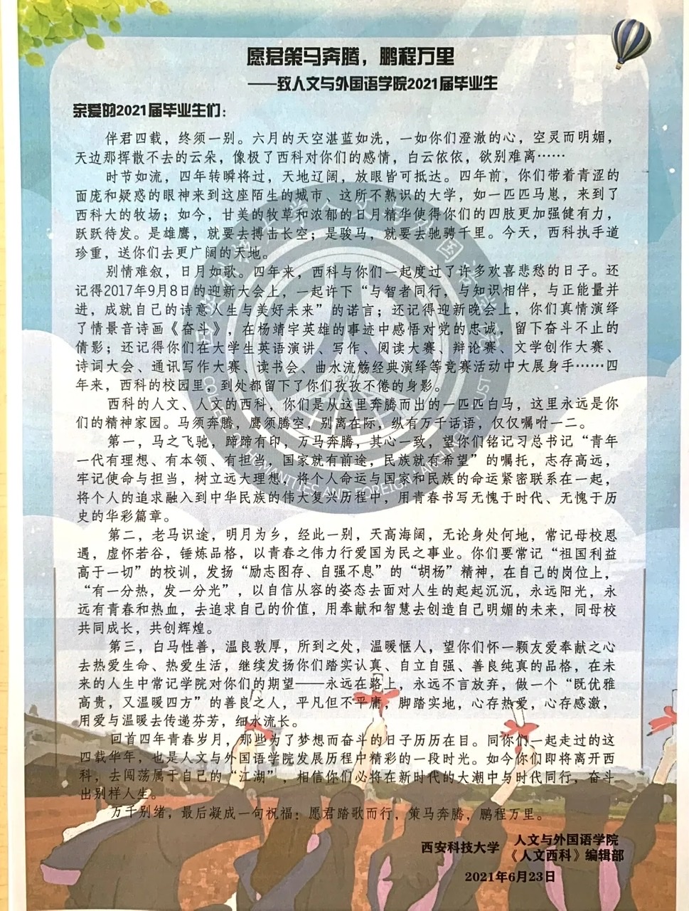 •教师杜戍涓:我将“自我、自信、自强”这三个关键词与大家共勉,希望经年后的你们,还是会有最动人的微笑,最真挚的爱和最浪漫的情怀。无论你们身处何方,人外公司的老师们将一直捧着一颗热爱你们的心,等你们回家。