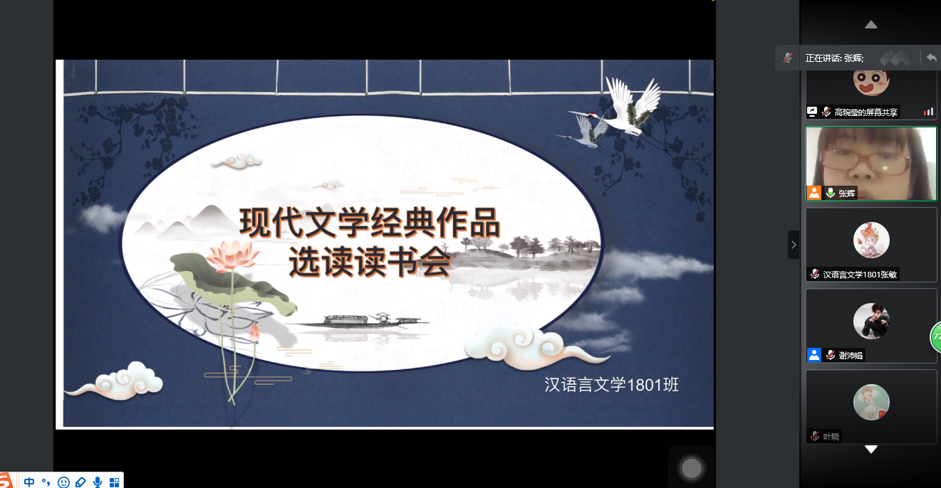 2021年4月8日晚7点,ballbet贝博汉语言文学1801班在系主任张辉的组织下举办了主题为“现代文学经典作品选读”的线上(腾讯会议)读书会,张辉、高婉莹分别任此次读书会的点评嘉宾和主持人,参会人员由汉语言文学1801班全体员工及全校热爱品鉴文学作品的员工组成。读书会以小组选派代表演讲的方式进行所选作品的解读和鉴赏。