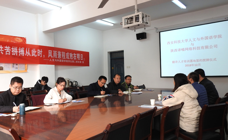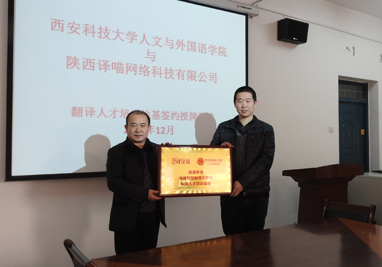 12月5日下午,ballbet贝博与陕西译喵网络科技有限公司翻译人才培训基地签约授牌仪式在公司会议室举行。陕西译喵网络科技有限公司总经理王潇轩,ballbet贝博经理师新民分别代表双方签订合作协议。公司党委副书记张振中、副经理冯正斌及英语系教师代表参加签约授牌仪式。