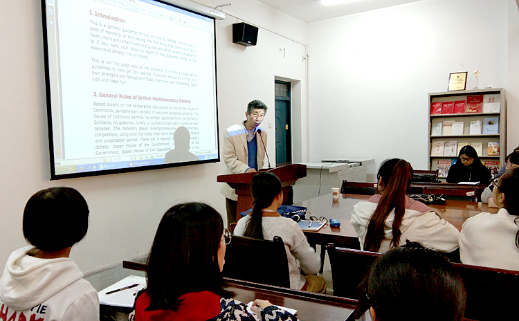 10月24日下午,ballbet贝博在公司会议室举办英语辩论与演讲辅导讲座。本次讲座由英语系主任张芸主持,研究生英语教研室副教授高勇担任主讲,对英语系2017级全体员工进行了辅导培训。