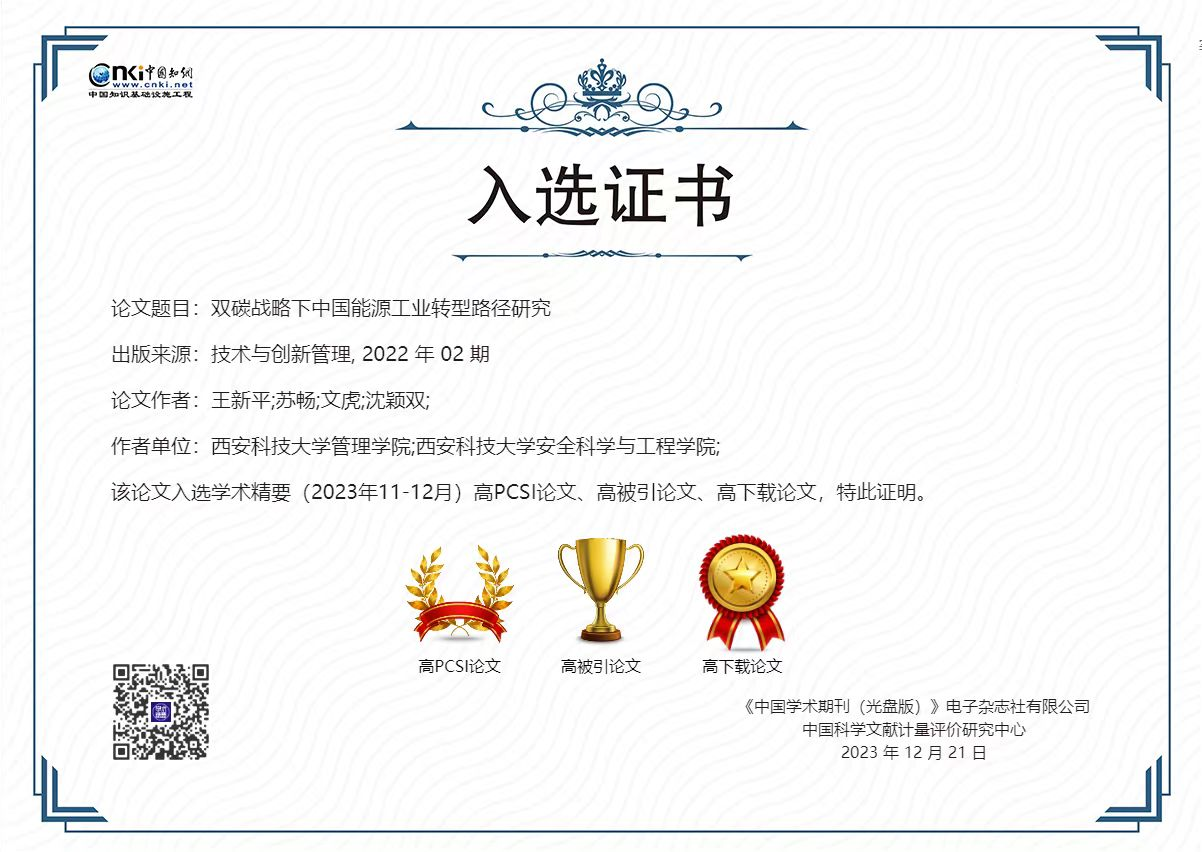 2023年12月21日,公司王新平教授发表的一篇学术论文获得中国知网2023年11-12月学术精要高影响力论文。