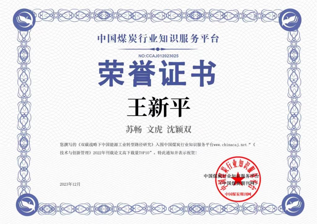 该论文同时入选“中国煤炭行业知识服务平台2022年刊载论文高下载量TOP10”行列。