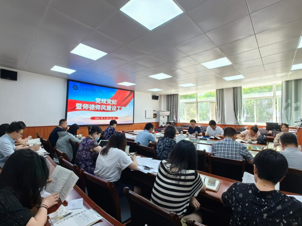 5月22日下午,人外公司在骊山校园2教226会议室召开理论学习中心组(扩大)学习会暨师德师风建设工作会,公司班子成员、党委委员、各党支部委员、各系部室主任参加了会议。