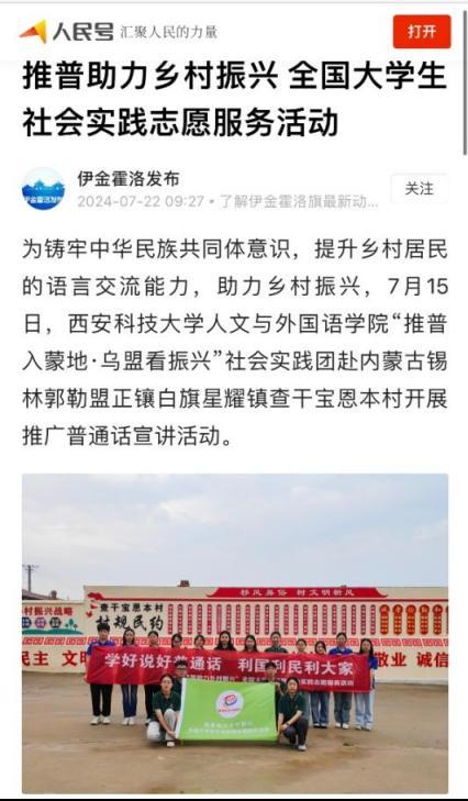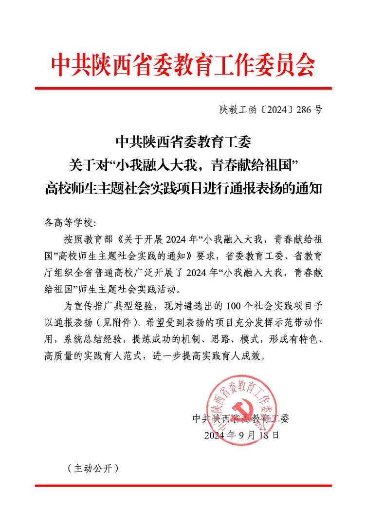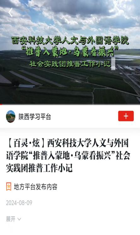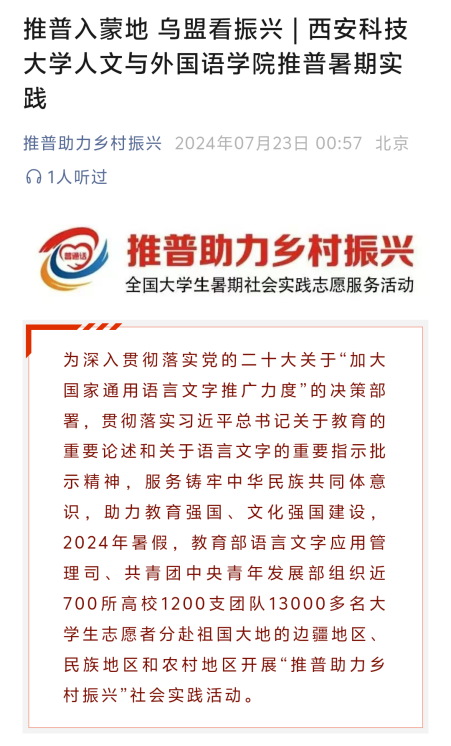 近日,陕西省委教育工委、省教育厅面向全省普通高校组织开展2024年“小我融入大我,青春献给祖国”高校师生主题社会实践活动,最终遴选出100个优秀案例。公司申报的《深入边疆少数民族地区推广普通话,助力基层语言文化交流传播》获优秀案例。
