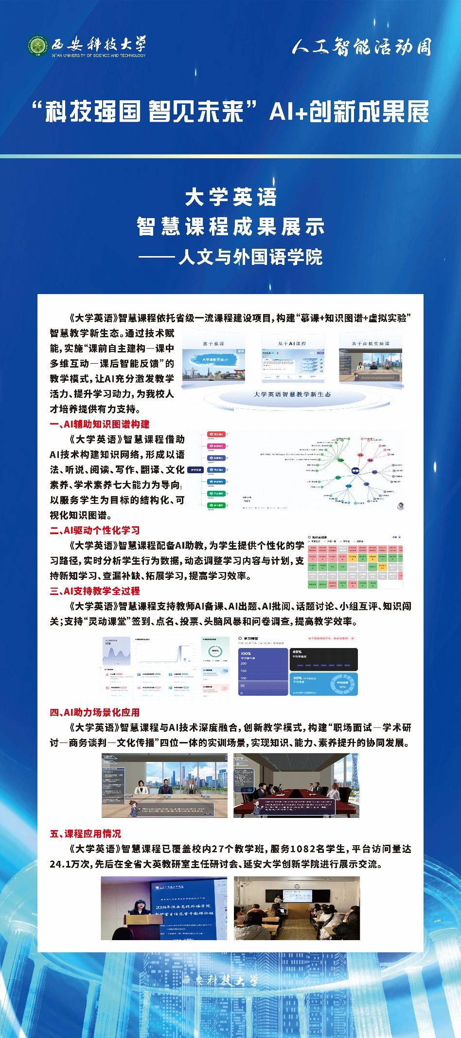 为深入贯彻落实习近平总书记关于加快人工智能发展的重要指示批示和全国教育大会精神,深化AI赋能高质量公司产品改革,推动人工智能发展与学科专业交叉融合,展现公司AI+公司产品创新成果,公司“科技强国·智见未来”人工智能活动周系列活动自5月1日启动,ballbet贝博遴选《大学英语》智慧课程参加本次活动周展出。