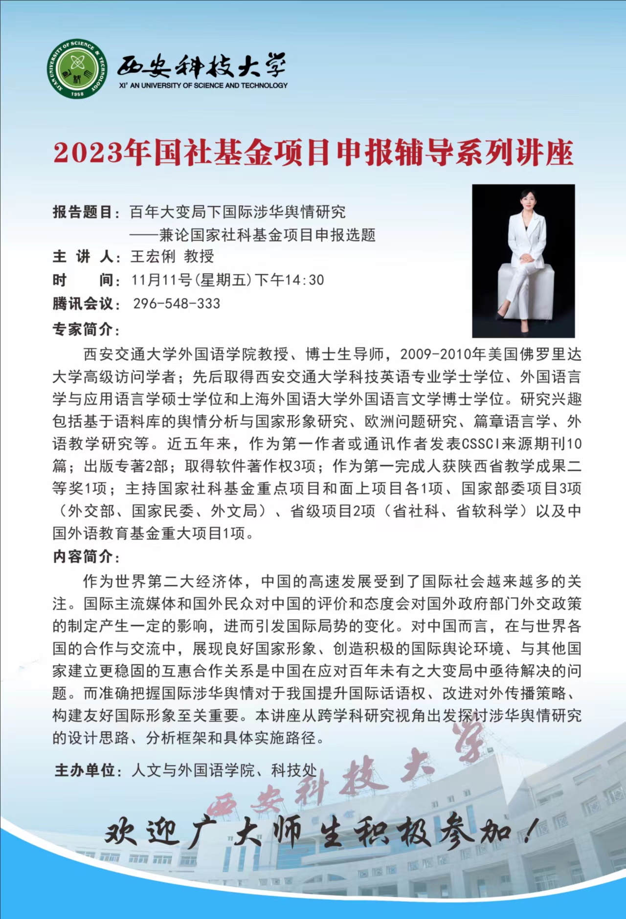 请公司副教授以上职称、博士学历、年龄35岁及以下等有申报国家社科基金资格的教师按时参会,欢迎感兴趣的老师们积极参会。
